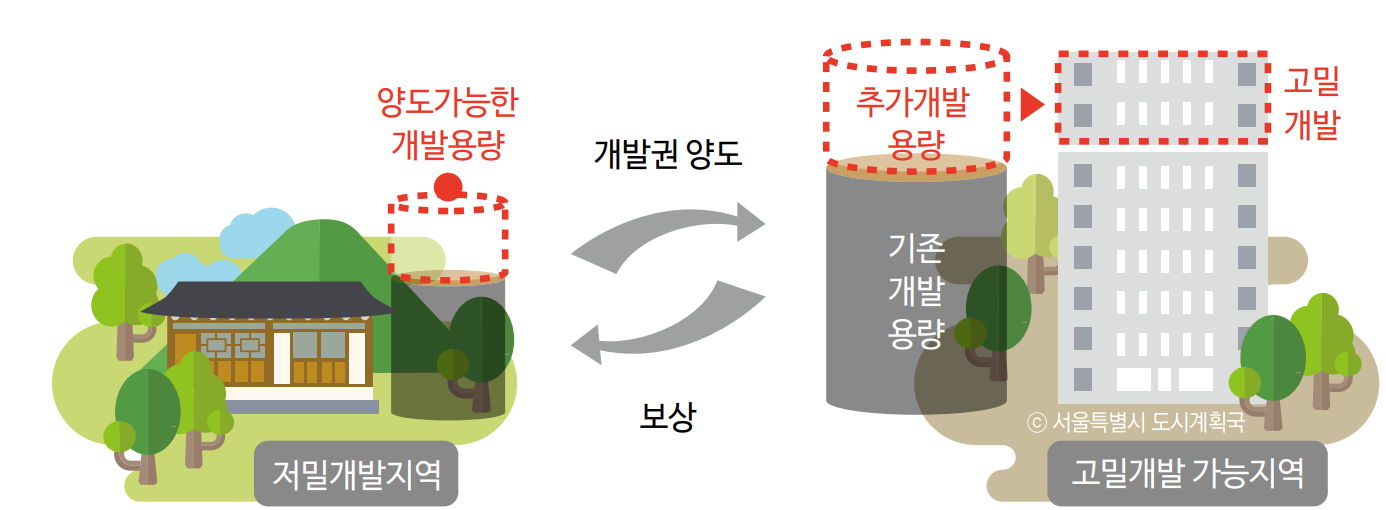 즉, 특정지역의 개발을 해당 법규보다 강하게 제한할 필요성이 있을 때 침해되는 재산권에 대한 보상 차원에서 개발권(법적용적률과 현재 이용용적률의 차이)을 매매 또는 양도할 수 있도록 허용함으로써 토지소유자는 재산상의 손실을 만회할 수 있다.